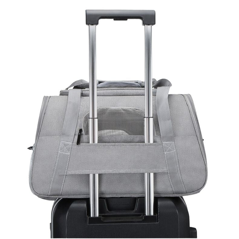 A luggage strap on the back lets this cat travel bag slide over a suitcase handle at stations and airports.